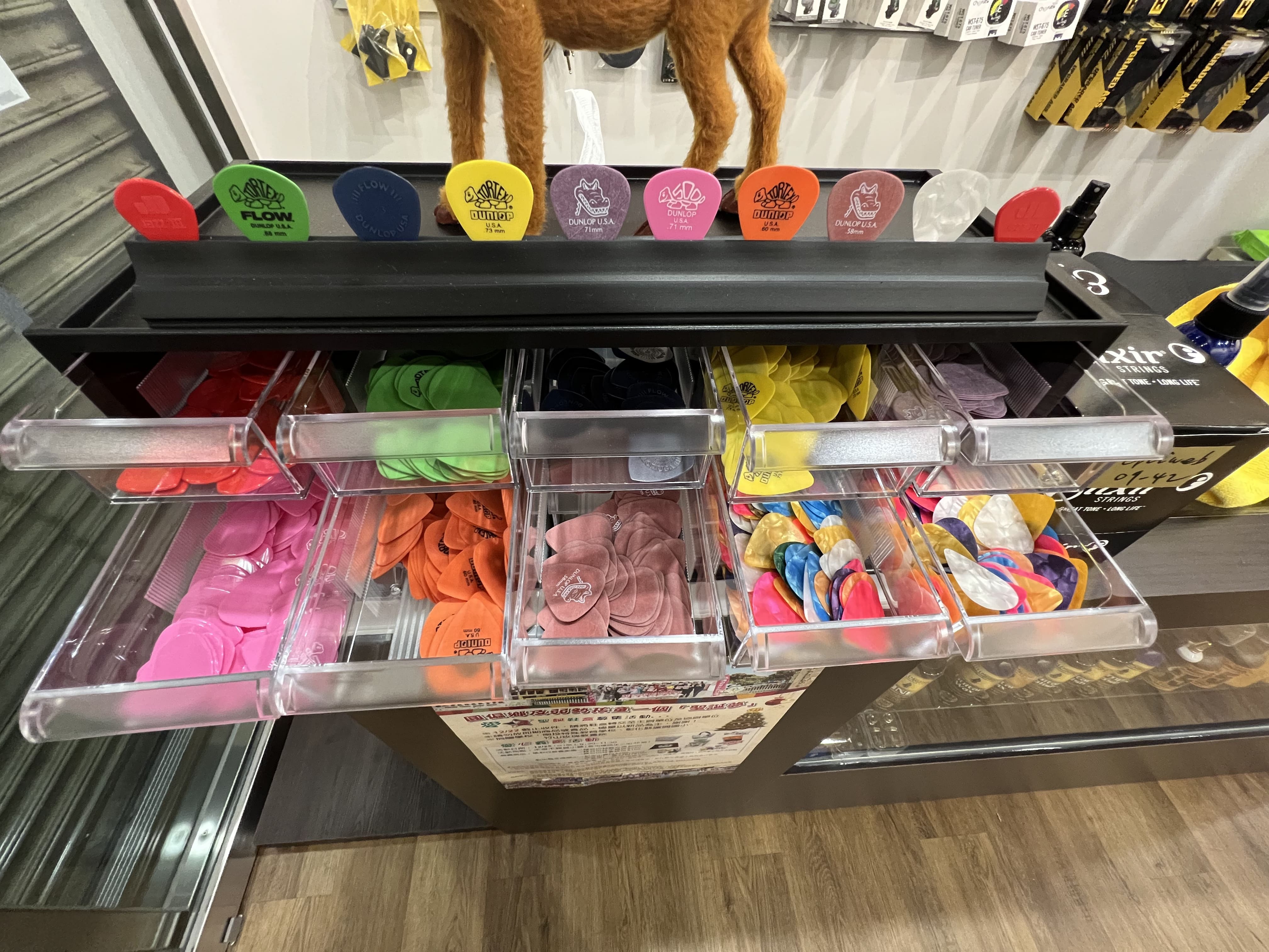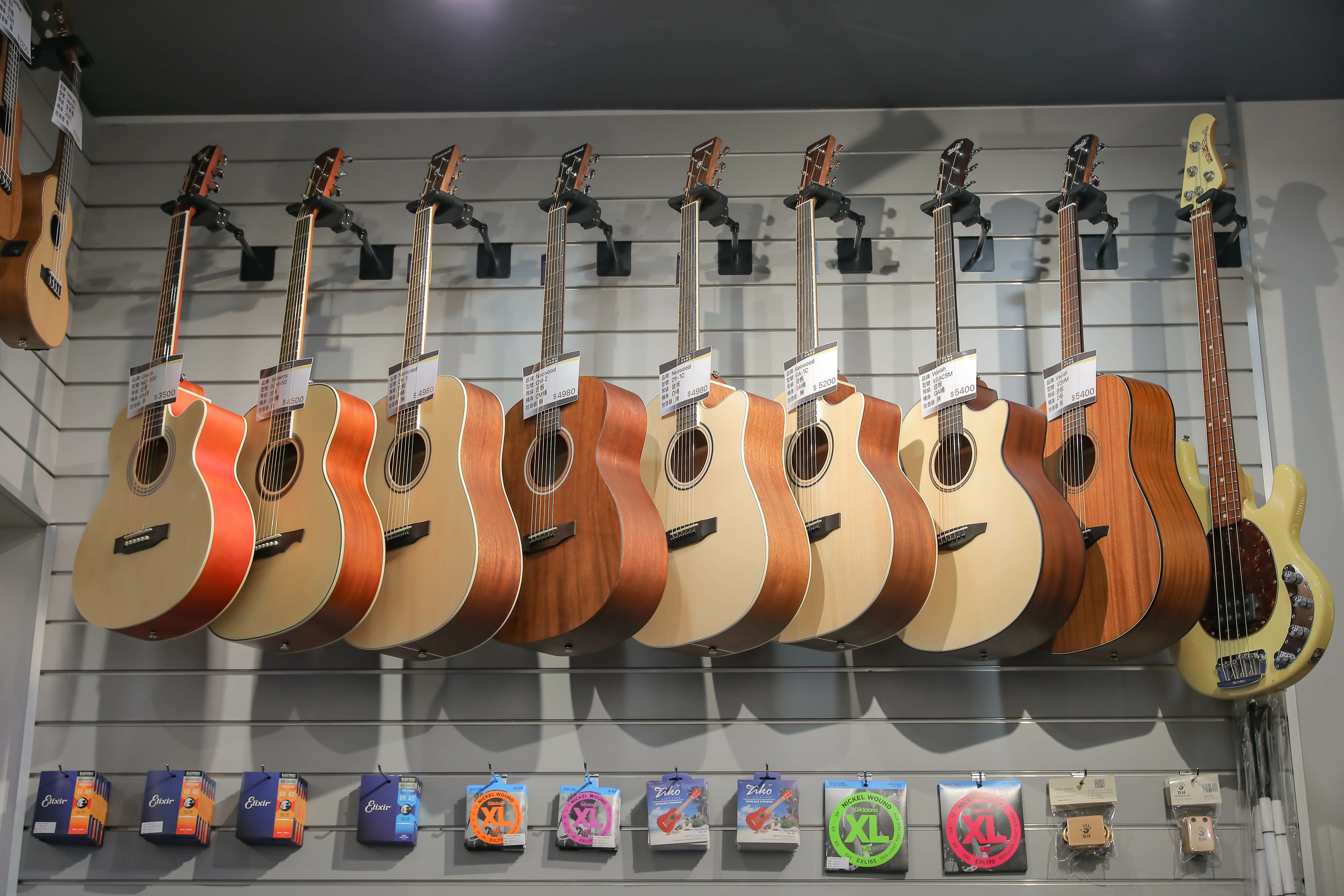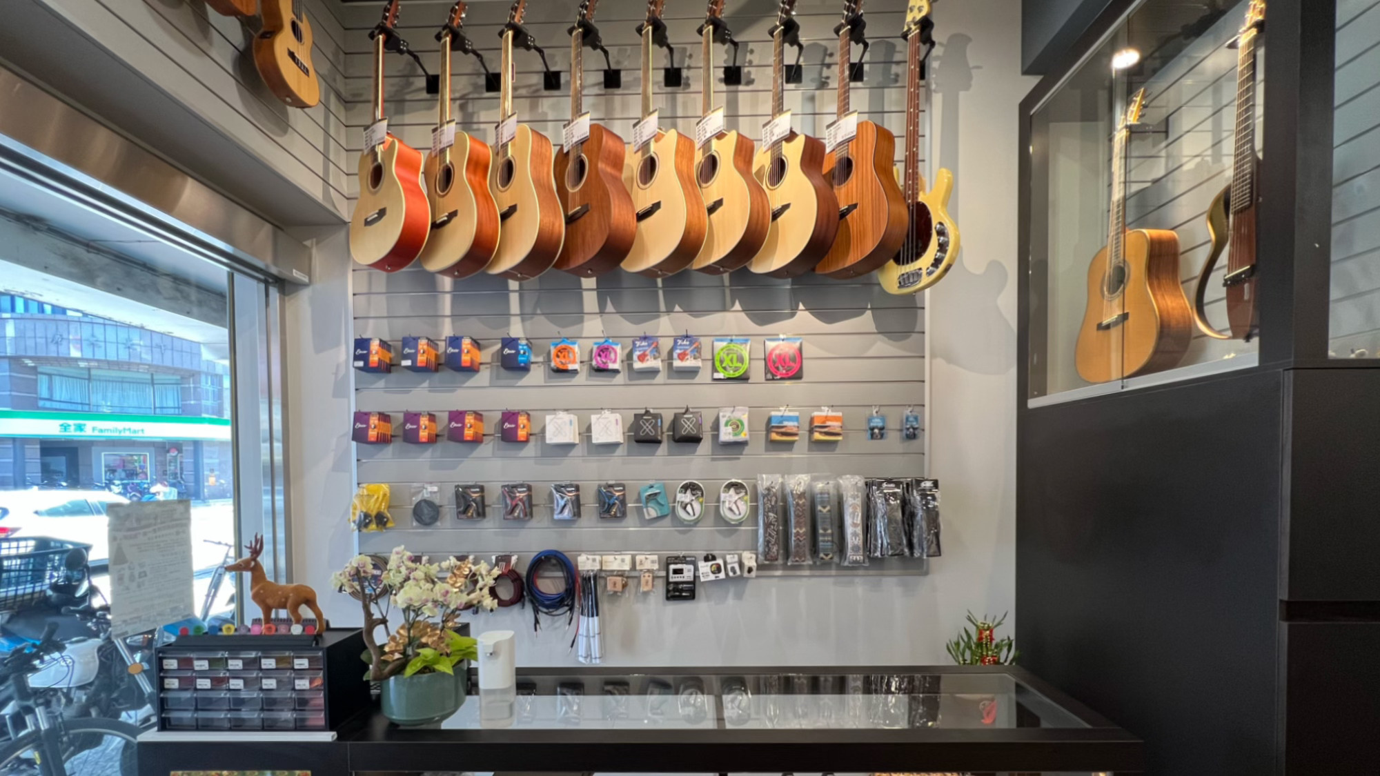 接著繼續往內走,可以看到玲瑯滿目的吉他、木箱鼓、烏克麗麗以及各種配件。